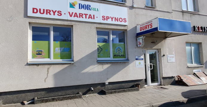 Su automobiliu įvažiavimas iš Lakūnų gatvės pro vartus. Įvažiavus, sukti į kairią, už kampo antras įėjimas, žali langai.