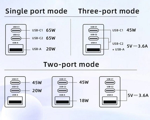 USB-C1+USB-C2+USB-A: 45W+18W; maks. 5V (3.6A).